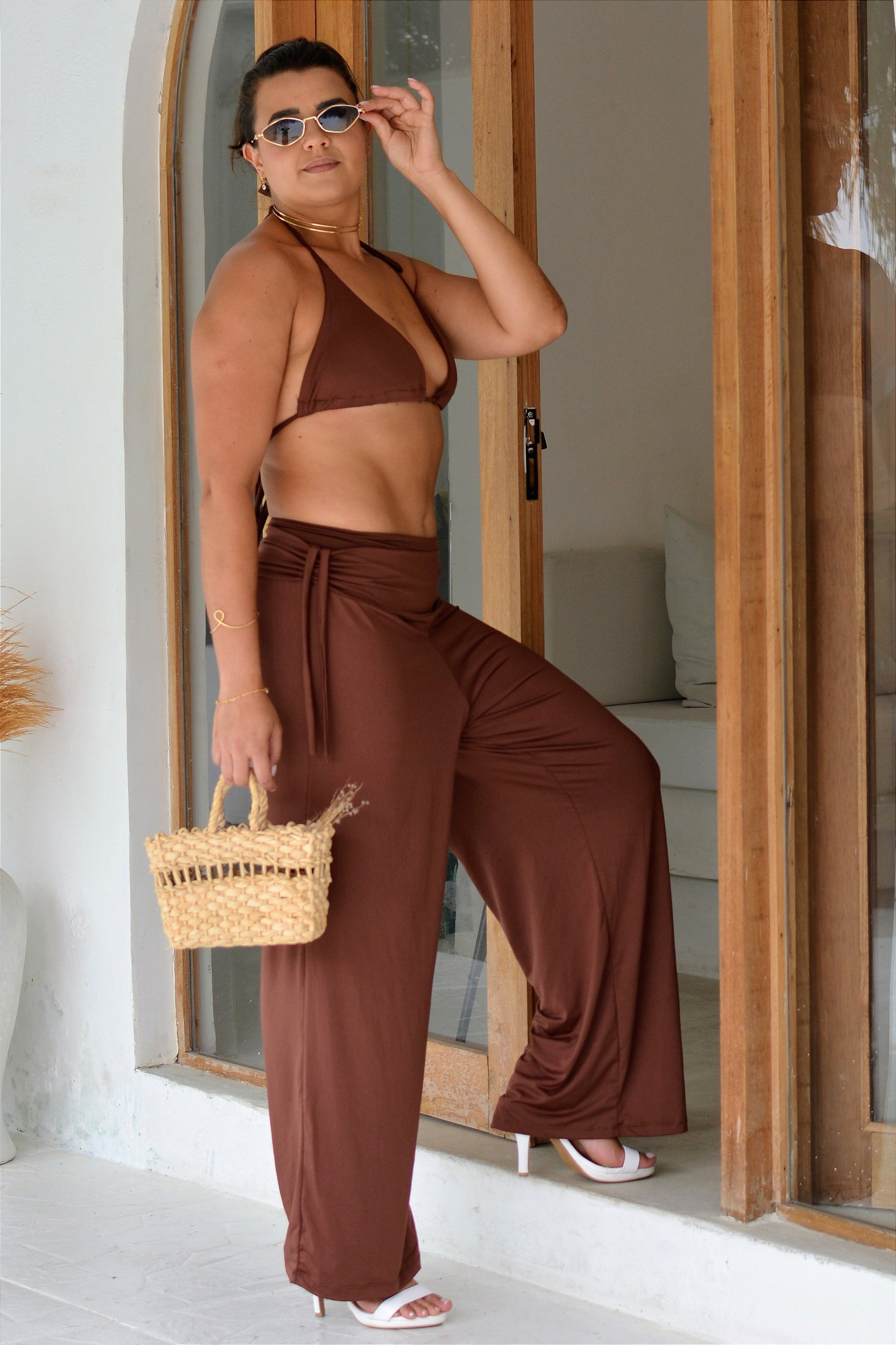 Confeccionado para vestir do tamanho 36 ao 42, o trio oferece tamanho único com ajuste perfeito, valorizando as curvas femininas com elegância. A calça adiciona um toque sofisticado, ideal para passeios na praia ou piscina.